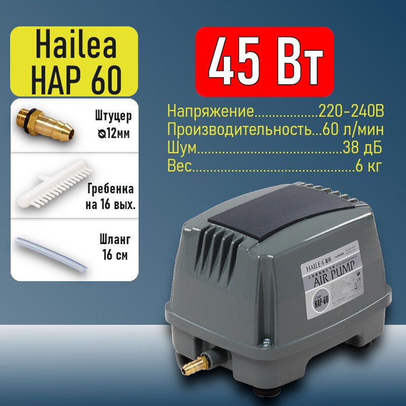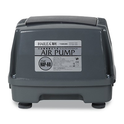 Компрессор HAILEA HAP-60 производительностью 60л/мин, используется для аэрации пруда, аквариума, пузырьковой панели, септика, в станциях биологической очистки сточных вод.